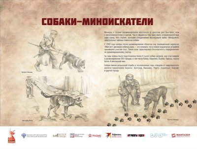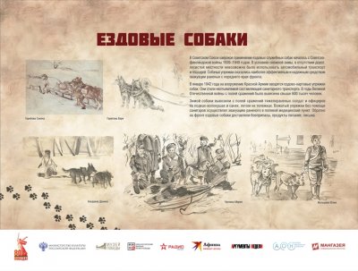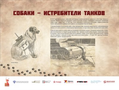 Выставка рассказывает братьях наших меньших – собаках, которые внесли большой вклад в общенародное дело Победы над нацистской Германией. Более 60 000 мохнатых героев прошли боевой путь от Москвы до Берлина. Во время войны части и подразделения Красной Армии впервые в военной истории массово, разнообразно и эффективно применяли служебных собак. В центральной школе военного собаководства животных готовили по 11 видам служб – связи, розыскной, караульной, сторожевой, противотанковой, санитарной, диверсионной, для химической разведки, авиасигнальной, ездовой и минно-розыскной.